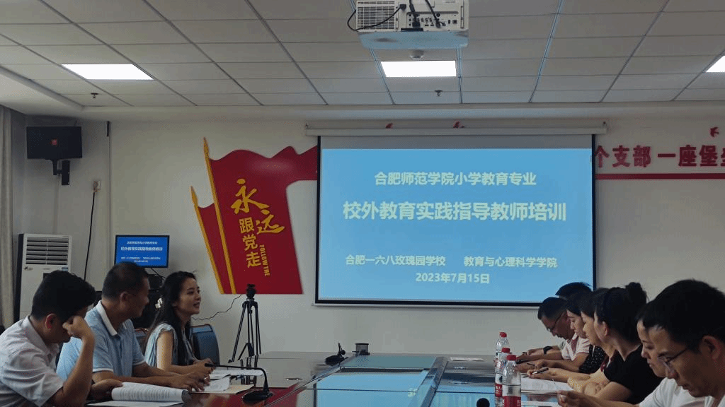 (本网讯)7月15日上午,滚球买球的app官网副院长闫龙一行三人赴合肥一六八玫瑰园学校东校区开展校外教育实践指导教师培训工作。合肥一六八玫瑰园学校东校区执行校长陈炳炎出席培训会,该校15名滚球买球的app官网小学教育专业校外教育实践指导教师参加会议。