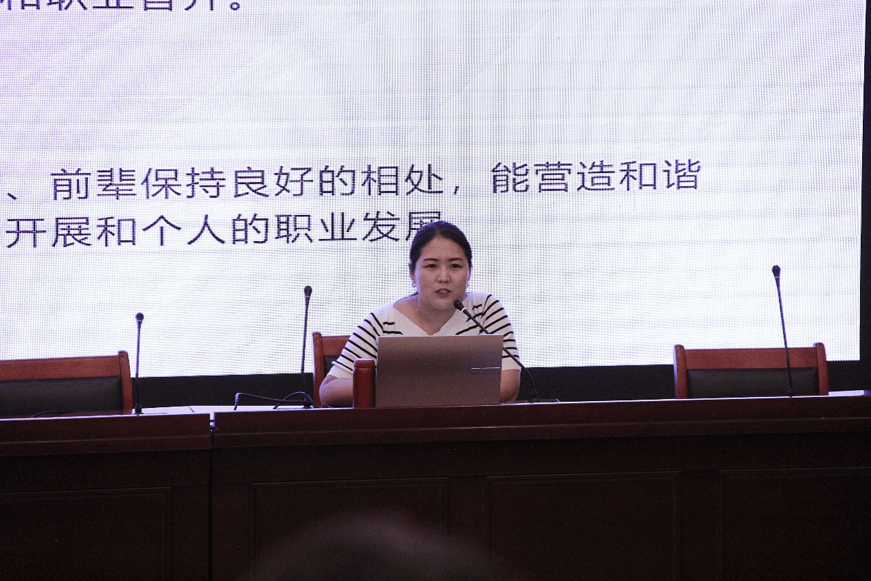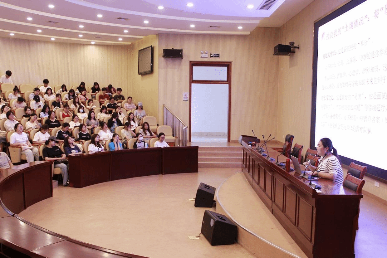 杨晓琦以“引言、扎根、生长、繁茂、结语”为主线,结合个人学习与职业发展经历,系统分享了从学生到教育管理工作者的成长历程与实践思考。她紧扣习近平总书记关于“四有”好老师的重要论述,指出教育工作者不仅应具备扎实的知识能力,更应坚定理想信念、涵养道德情操、践行仁爱之心。在“扎根”部分,她围绕岗位选择、信息获取与面试准备等环节,为同学们提供了切实可行的备考建议,倡导以问题为导向深化学习,实现“学以致用”。