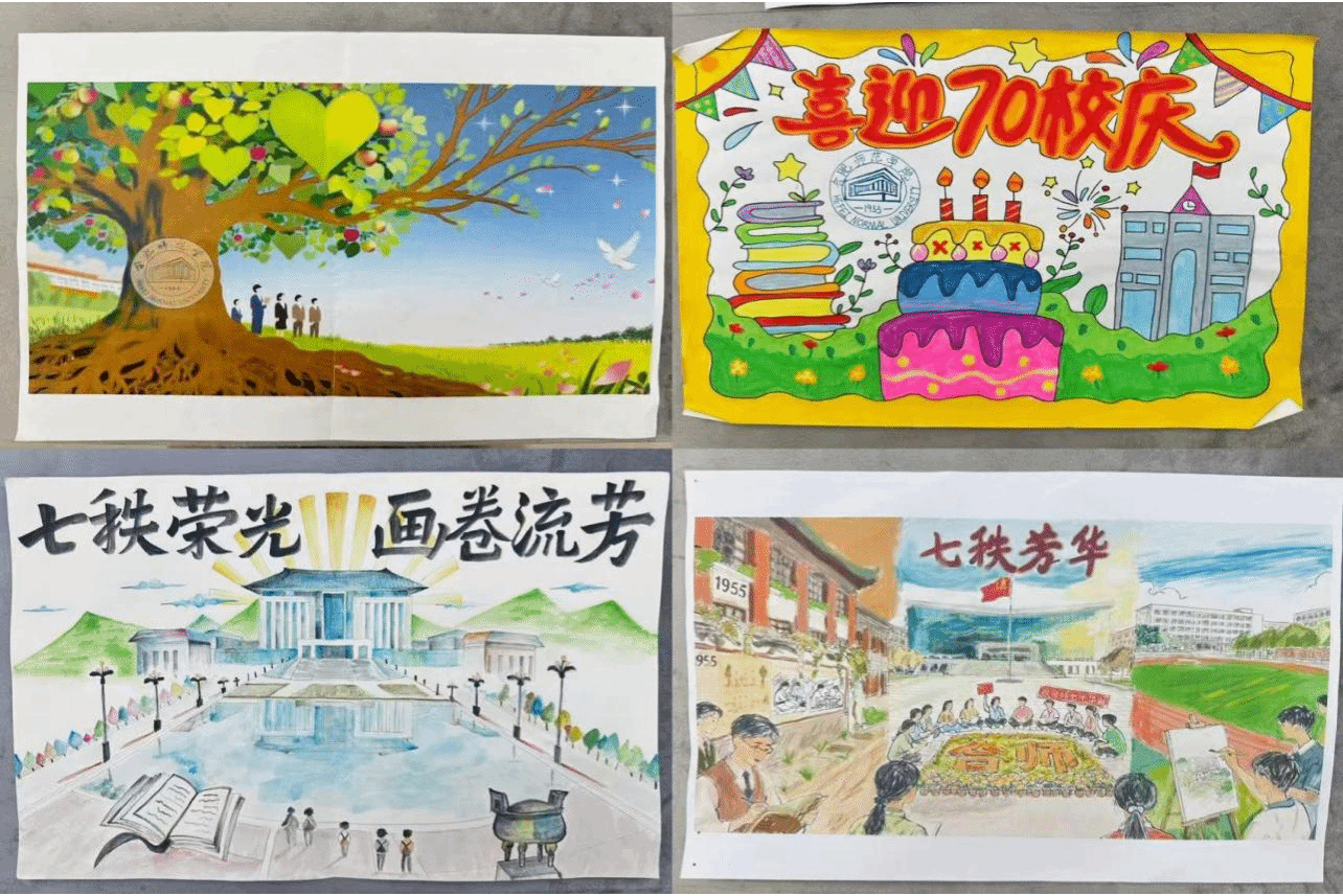 大赛围绕校庆主题,鼓励学生将“爱满天下,知行合一”的校训精神融入艺术创作,以“70”为创意线索,串联学校发展历程中的重要节点,在画面中凝结历史记忆与时代担当。参赛作品题材丰富、风格多样,既有对校园景致的情感描摹,也有对教育理想的意象表达,展现出学子扎实的专业功底与真挚的母校情怀。2024级小学教育专业杨紫玥、2024级小学教育专业杨蓝玲、2024级小学教育专业韩梦雯三位同学凭借其独特的构图视角、娴熟的绘画技法与深刻的主题表达荣获一等奖。目前,优秀作品已在学院一站式学生社区“润心·桃李”工作坊集中展出,吸引了众多师生驻足欣赏,成为校庆期间一道亮丽的校园文化风景。