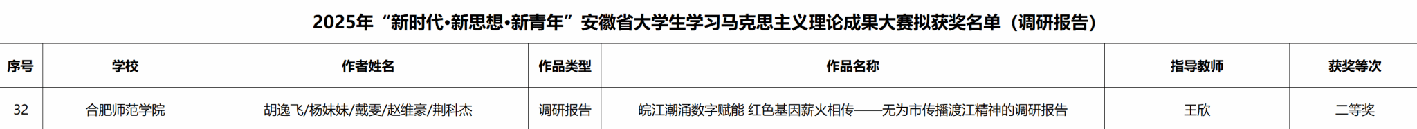 近日,2025年“新时代·新思想·新青年”安徽省大学生学习马克思主义理论成果大赛评选结果正式公布。滚球买球的app官网学子胡逸飞、吕梓玥分别组建的参赛团队,在马克思主义学院王欣老师的精心指导下,荣获调研报告类二等奖1项、研究论文类三等奖1项,以扎实的成果展现了教院学子坚定的理想信念与过硬的专业素养。