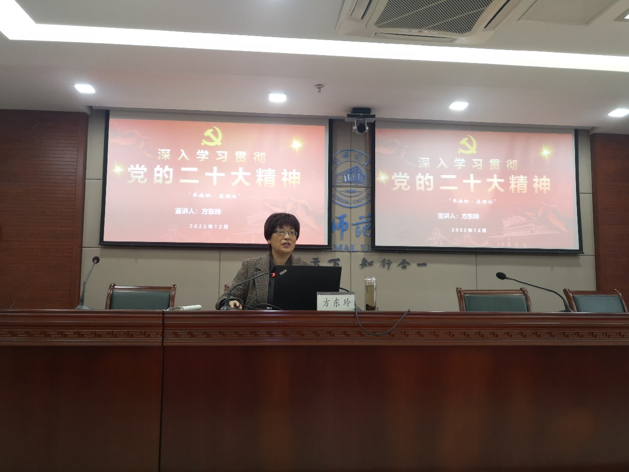 为深入学习宣传贯彻党的二十大精神,切实引导教师教育学院全体干部师生把思想、认识和行动统一到党的二十大精神上来,12月7日下午,在锦绣校区行知楼2011会议室,院党委副书记、校长方东玲做深入学习贯彻党的二十大精神宣讲报告。教师教育学院党委理论学习中心组全体成员,全体教师与学生代表、学生党员、入党积极分子代表,发展规划处党支部全体党员、人事处代表等参加。