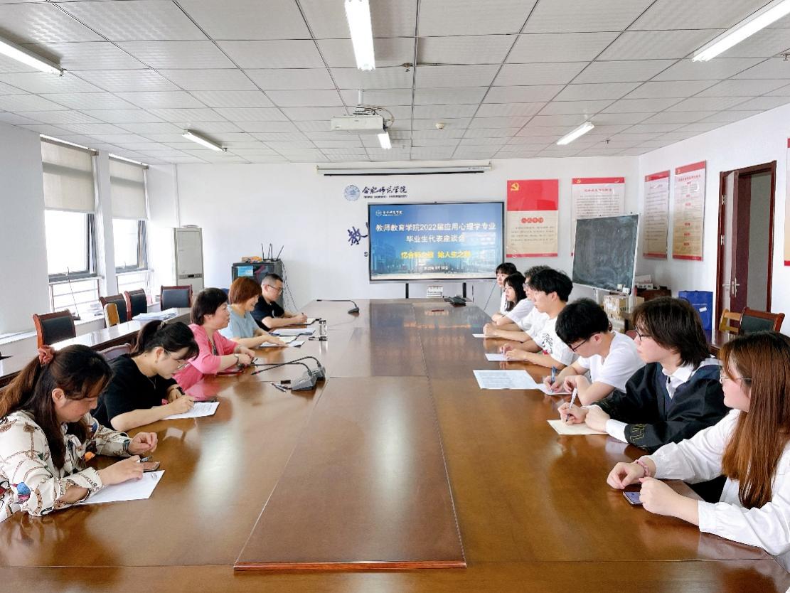 5月25日上午,教师教育学院在行知楼710会议室举行2022届应用心理学专业毕业生代表座谈会。教师教育学院院长李群、心理系主任吴桂翎、教师代表晋玉、胡哲和吴姗姗出席座谈会,2022届应用心理学专业梁天翔、杨金艳、王瑞等8位毕业生代表参加了座谈会。座谈会由吴桂翎主持。