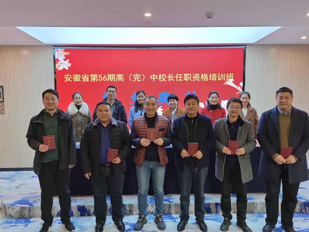 2021年12月7日上午,教师教育学院承办的安徽省第56期高(完)中校长任职资格班在合肥市曼斯顿酒店举行了结业典礼。教师教育学院党委书记穆娟、院长李群、干训部主任胡连峰、班主任张珍珍,学生助理王艺舒以及来自全省各地73位校长班全体学员参加了结业典礼,典礼由胡连峰主持。