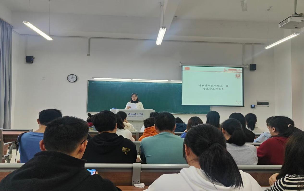 会议首先由王雨欣代表学院上一届学生会,汇报了学生会工作的情况和取得的成绩。在学院党委的领导和分团委的指导下,学生会带领着同学们扎实开展党史学习教育,提升组织力、引领力、服务力,顺利完成迎接新生工作与学生会招新工作,积极开展丰富多彩的文体活动,努力构建引领型和服务型的学生会。王雨欣还对下一阶段学生会各方面工作进行了展望。