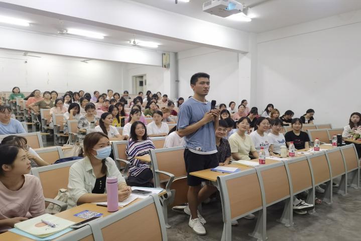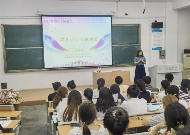 活动中,张承梅介绍了包河区幼教发展情况,以数据呈现了合肥市包河区幼儿毛入园率、普惠性幼儿园覆盖率、公办园在园幼儿占比率等情况,超额完成学前教育“985”目标。在介绍启明星幼教集团发展历程时,分享了集团快速发展成为拥有十所分园的办园历程与办园特色,积极向上的发展态势与幼教工作者的努力劲头也深深激励了在场的学生们。同时,张承梅也向同学们提出了当前幼儿教育工作中所面临的问题,勉励学生珍惜在校时光、努力学习,期待通过同学们的努力去推动学前教育有质量的发展。