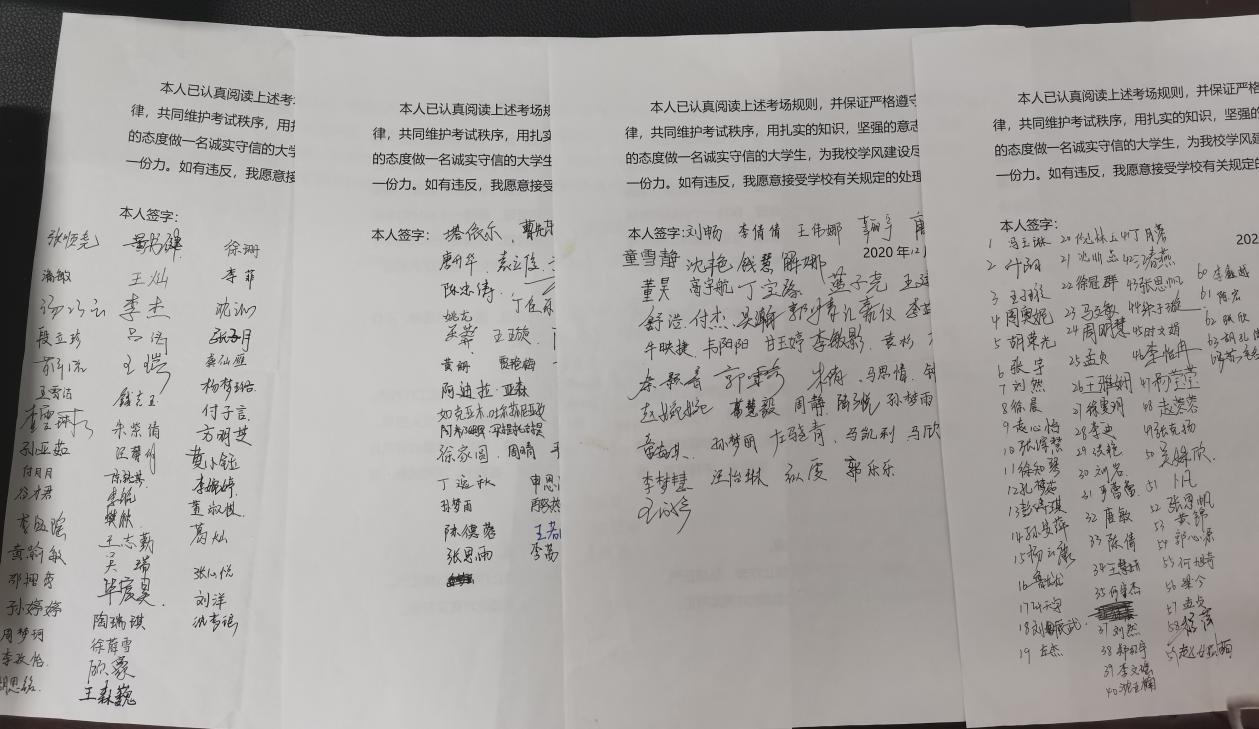 班会上,辅导员带领同学们学习了《学生手册》上有关诚信考试的相关内容以及考试违纪、作弊处理办法。随后,辅导员唐淼强调了期末考试的重要性,要求同学们在考试前要努力攻克学习中遇到的难题,多与老师和学生沟通,合理安排作息时间,树立自主学习的意识,坚定自己的信念。会上各班级组织学生签署了《诚信考试承诺书》。每个同学在认真阅读承诺书后,庄重地填写上自己的名字,这不仅是签名,也是每个同学的承诺,更是对诚信考试的决心。通过此次主题活动,让学生们充分认识了诚信考试的重要性,认识到培养良好的道德品质的重要性,要从身边每一件小事做起,从自身做起。