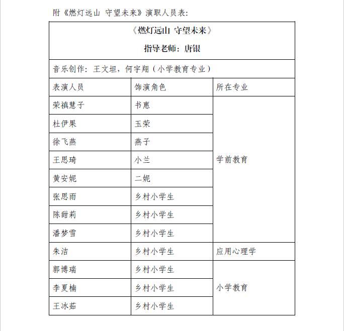 该舞台剧以原创形式,讲述了一位滚球官网毕业的小学教师赴乡村支教,在留村任教和去城市发展之间犹豫不决,最后被孩子们充满不舍的歌声所打动,选择继续支教的故事。该剧展现了合师人为了乡村教育,舍弃个人利益的时代大爱,紧贴乡村振兴的号召要求,充分体现了“爱满天下,知行合一”的校训精神和滚球官网师范专业特色。