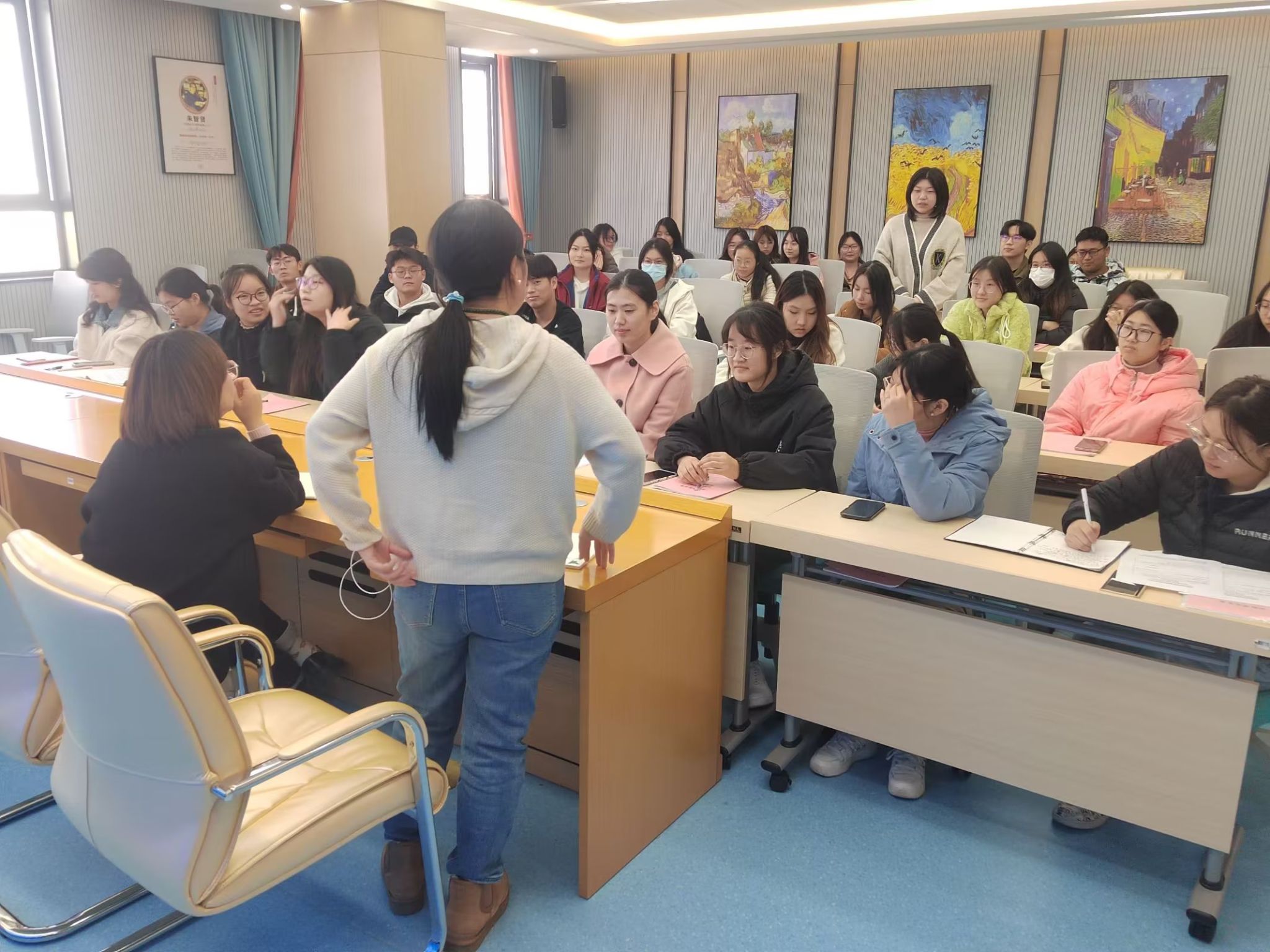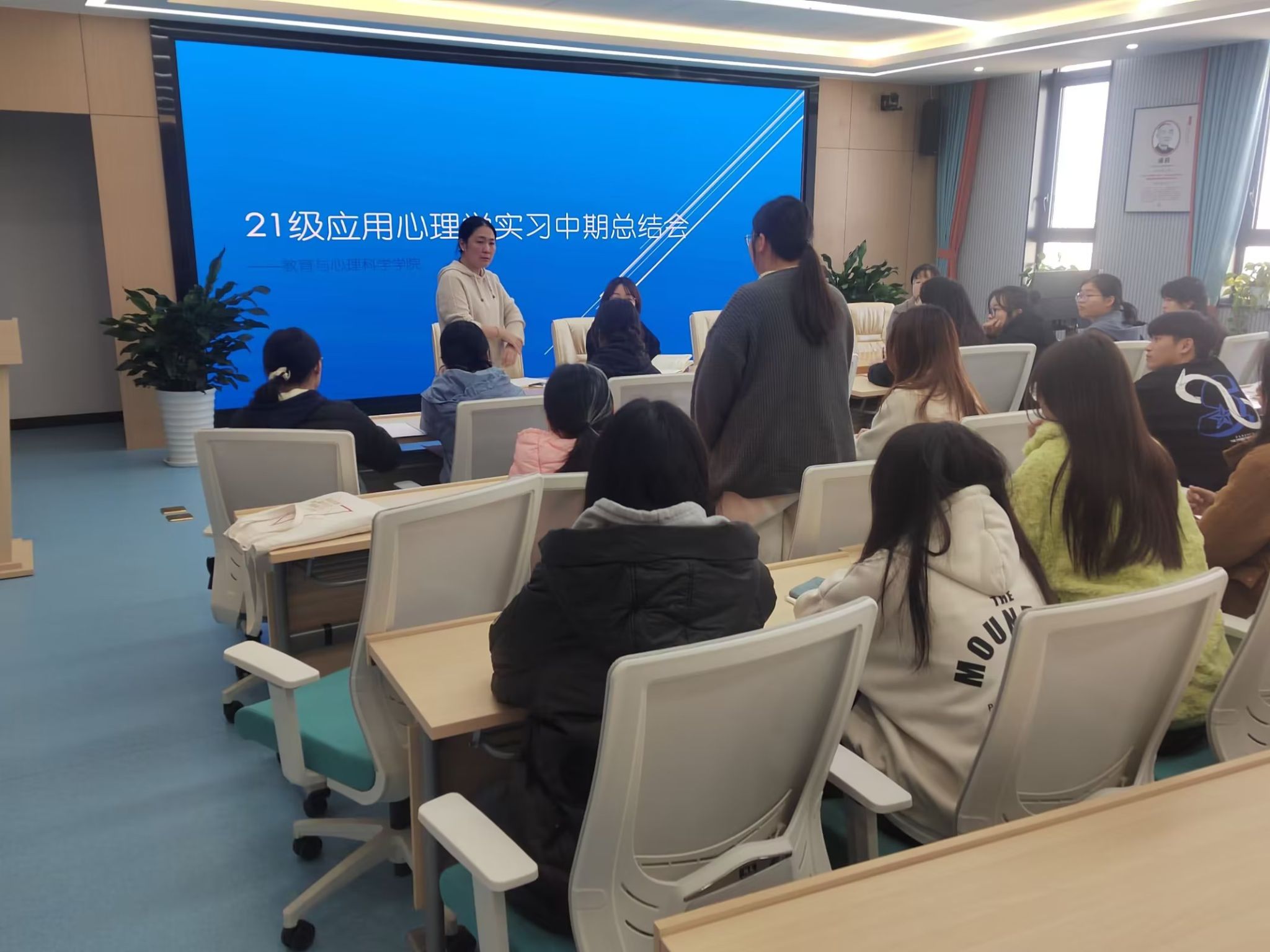 胡哲介绍本次实习中期总结大会目的在于总结分享这段时间的实习经验,更好地安排工作。黄凤根据近期实地巡查实习情况,对实习生们接下来的工作提出要写真实内容,及时填写实习手册,积极思考学生心理发展问题,主动了解心理老师的工作任务等具体建议。